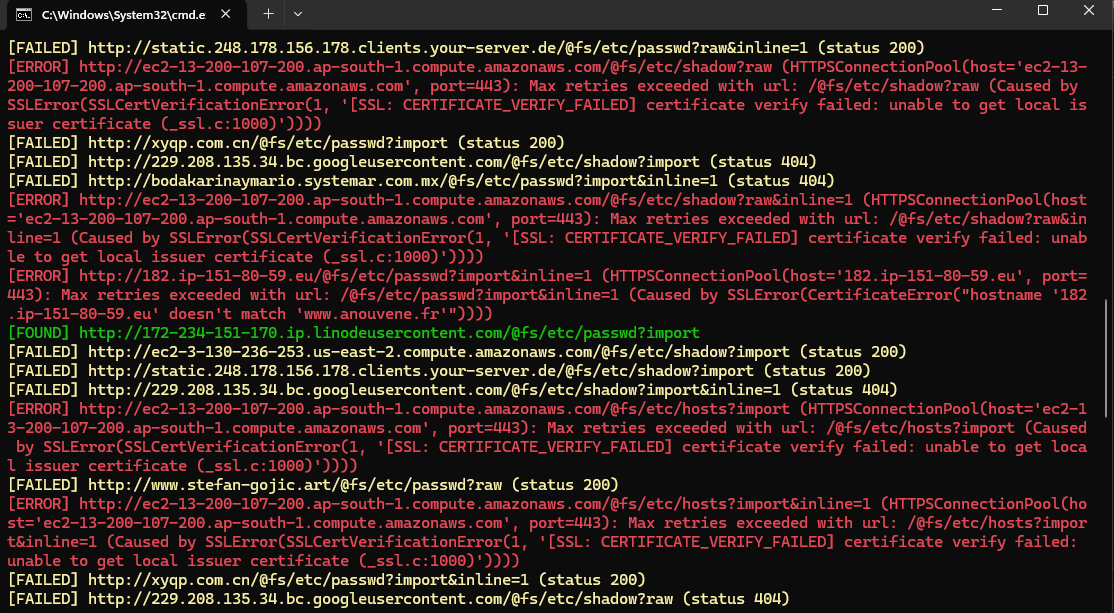 - Attempts to read a wide range of sensitive files via the Vite dev server file read vulnerability.